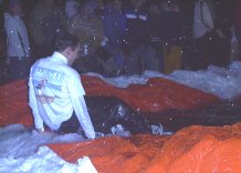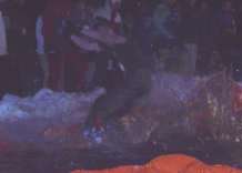 Nach Beendigung des offiziellen Teils des Snowboard-Contests hatten die Veranstalter noch einen besonderen Leckerbissen auf Lager. Im Gelände des Zieleinlaufs errichteten die Teilnehmer der Wettkämpfe zusammen mit der Oberwiesenthaler Feuerwehr ein Wasserbecken von ca. 3x4m. Einige mutige Teilnehmer wagten die Fahrt über das Wasser. Um auch hier den besten zu ermitteln, wurde der Anlauf von Durchgang zu Duchgang verkürzt. |