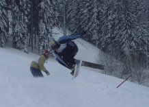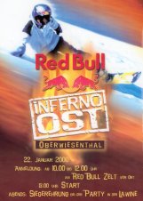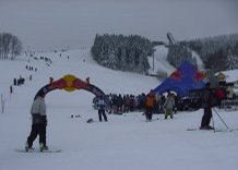 dem Hauptsponsor Red Bull den 1. Snowboard-Contest von Oberwiesenthal. 13:00 Uhr begann der Wettkampf, bei dem der Spaß am Snowboarden an erster Stelle stand. Gestartet wurde in Gruppen von bis zu 11 Teilnehmern, die zunächst einige Meter bis zu ihrem Board zurücklegen und anschnallen mußten. Auf der Rennstrecke "Am Wäldchen" verhinderten zudem mehrere Slalomtore und Schanzen die geradlinige Abfahrt ins Ziel. Eine bestens präparierte Piste aus Pulverschnee ließ einige Teilnehmer des Contests weich fallen. |